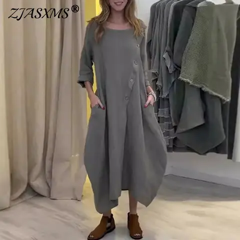 새로운 레트로 솔리드 코튼 린넨 롱 드레스 여성 패션 크루 넥 버튼 포켓 드레스 봄 캐주얼 긴 소매 느슨한 맥시 드레스