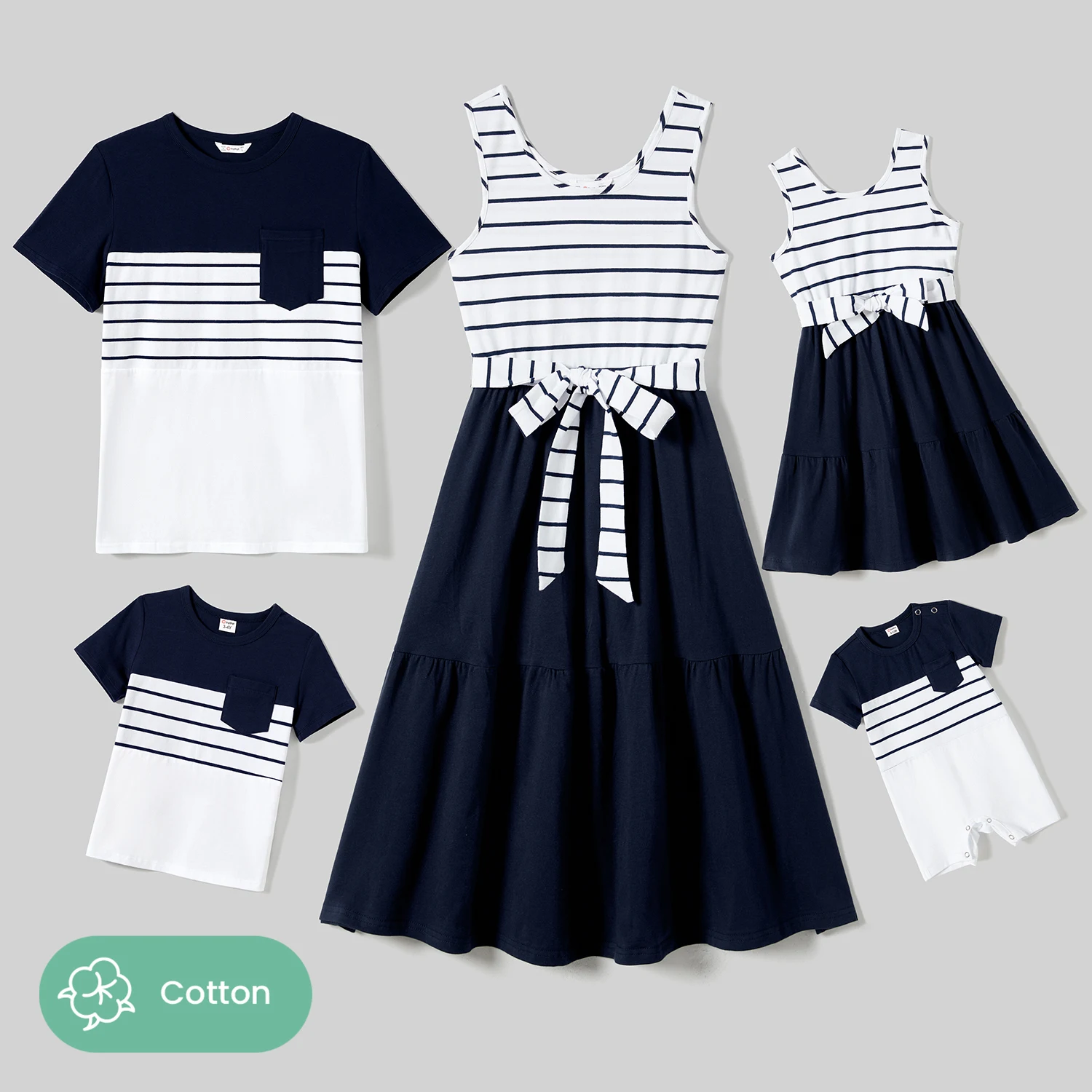 PatPat 패밀리 매칭 스트라이프 패널 벨트 탱크 드레스 및 코튼 컬러 블록 반팔 티셔츠 세트